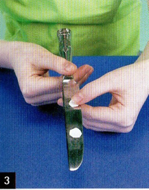 Prepare by tearing off four identical circles of the paper napkin. Moisten them and stick two on each side of the knife blade. Make sure that both sides look identical. Hold the knife in your right hand as shown (1).
